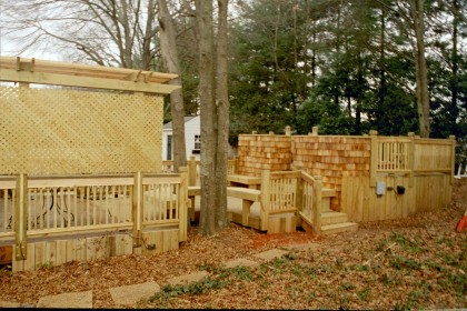 This ornate deck for entertaining includes a built in jacuzzi platform, as well as seating and planters. Cedar trim was also added.