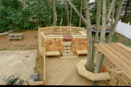 This ornate deck for entertaining includes a built in jacuzzi platform, as well as seating and planters. Cedar trim was also added.